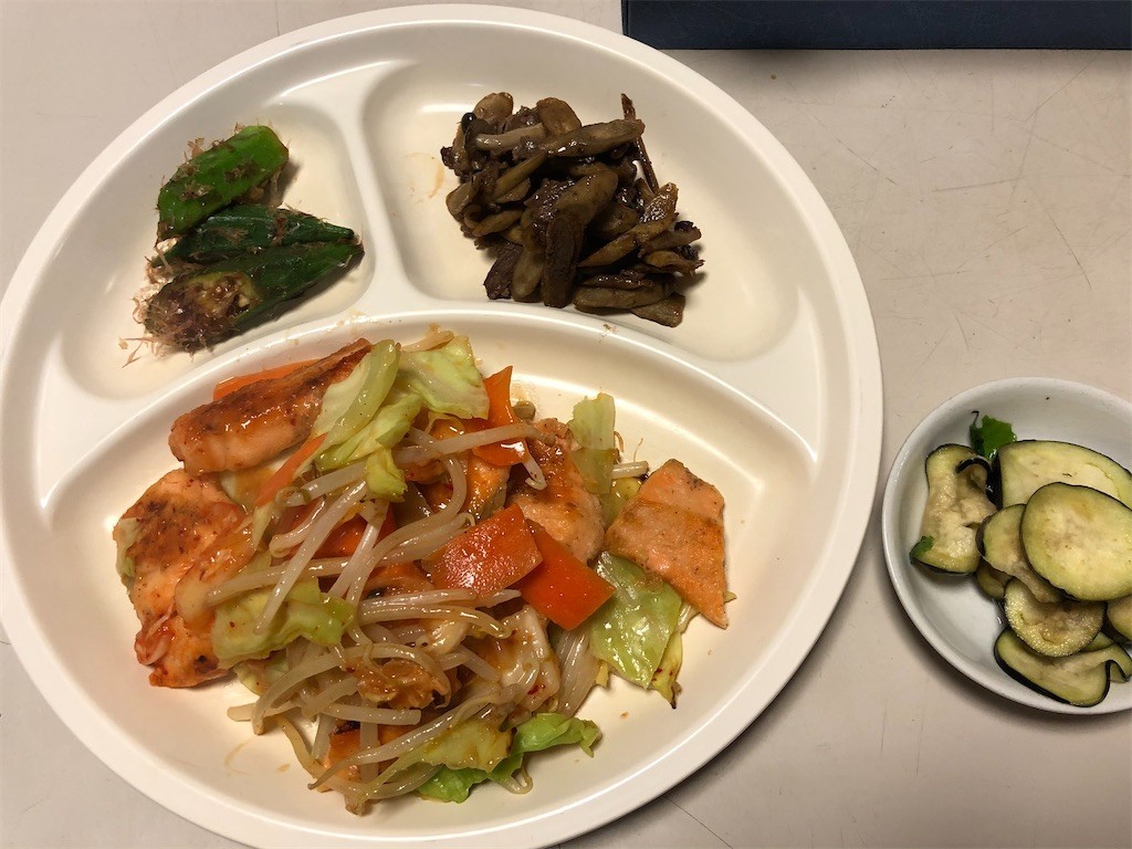 2021-03-16 スーパーに行った日 朝→トースト サラダ 目玉焼き ソーセージ 菊芋入りヨーグルト 生姜スープ 昼→クリームシチューオムライス サラダ 夜→ご飯 鮭のキムチちゃんちゃん焼き 牛肉と牛蒡の焚き物 オクラのおかか和え 茄子の浅漬け 茄子の浅漬けは微妙な味だった。