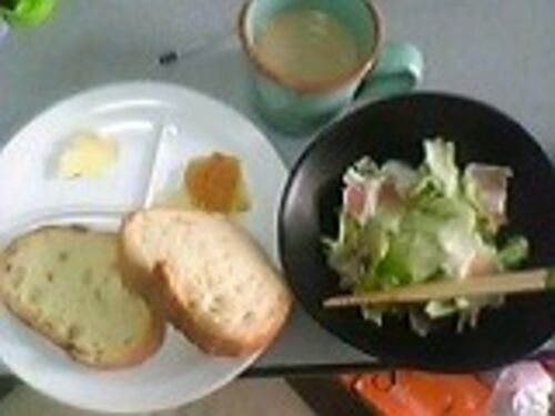 朝→フランスパン2切れ シーザーサラダ カフェオレ(0円) 昼→なし 夜→ごはん 焼き魚[塩サバ] スクランブルエッグ ゴーヤのおひたし(0円)