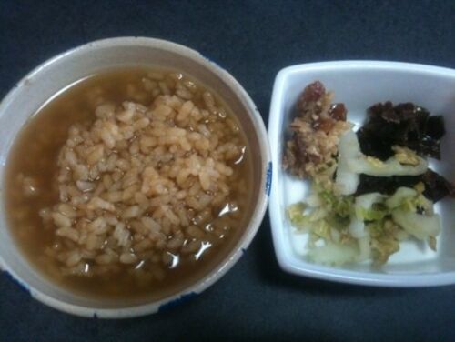 朝→おかいさん 漬け物 昼→塩サバ弁当 夜→稲庭うどんと天丼(308円)