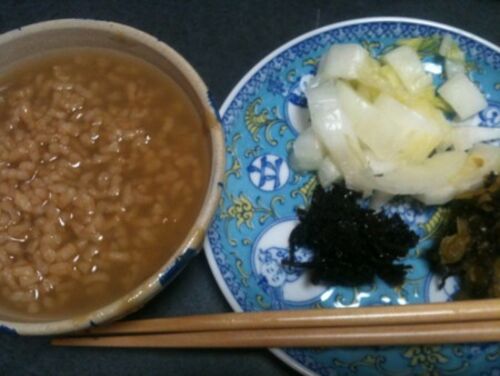 朝→おかいさん 漬け物 昼→鮭弁当 夜→玉ねぎとワカメのみそ汁 ホタテごはん 鮭 玉子焼き きゅうりとワカメの酢の物