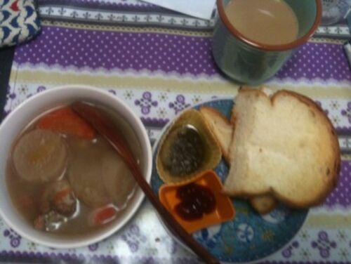 朝→ポトフ トースト カフェオレ 昼→ポトフ たらこクリームスパゲティ