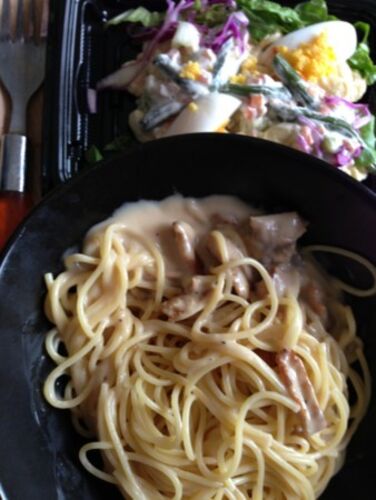 朝→なし 昼→デイッシュサラダ 豚肉のチーズクリームスパゲティ(500円くらい)
