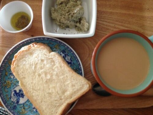 朝→トースト 一寸豆のペースト カフェオレ