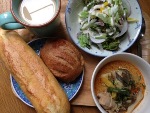 朝→なし 昼→明太フランス サラダ レッドカレー カフェ・オ・レ 夜→海老ほたてソースのパスタ サラダ