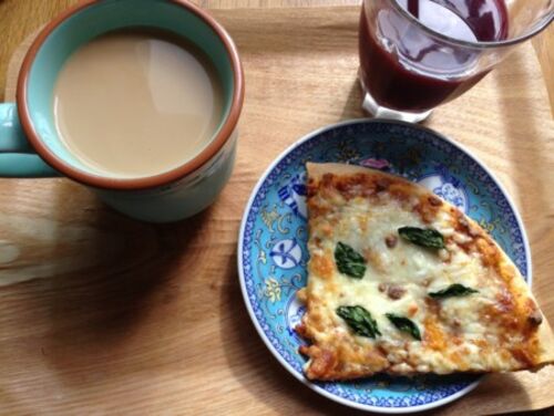 朝→ピザ カフェオレ 昼→和風きのこハンバーグ弁当