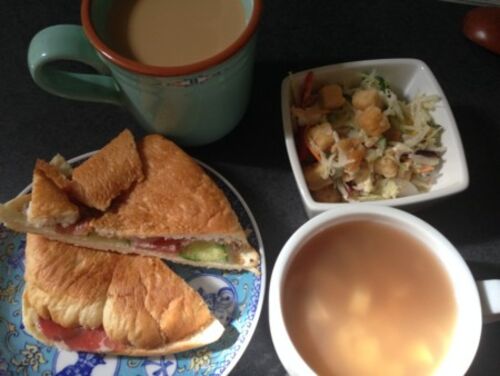朝→生ハムサンドイッチ サラダ チキンズッペ カフェオレ